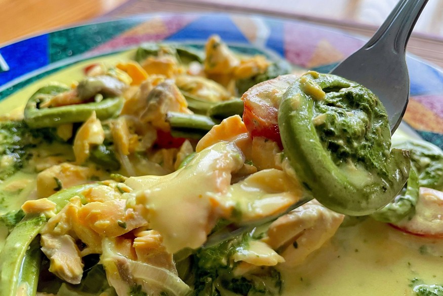 Puisant mon inspiration dans la riche et audacieuse cuisine de l'île de Sumatra, en Indonésie – où les fougères sont un délice courant, souvent mariées aux saveurs de la mer – j'ai imaginé cette recette mettant en vedette ma récente récolte de tendres têtes de violon. J'ai cherché à recréer l'équilibre vibrant des saveurs de Sumatra, avec ses notes ardentes et parfumées, en l'associant à la délicatesse du saumon.